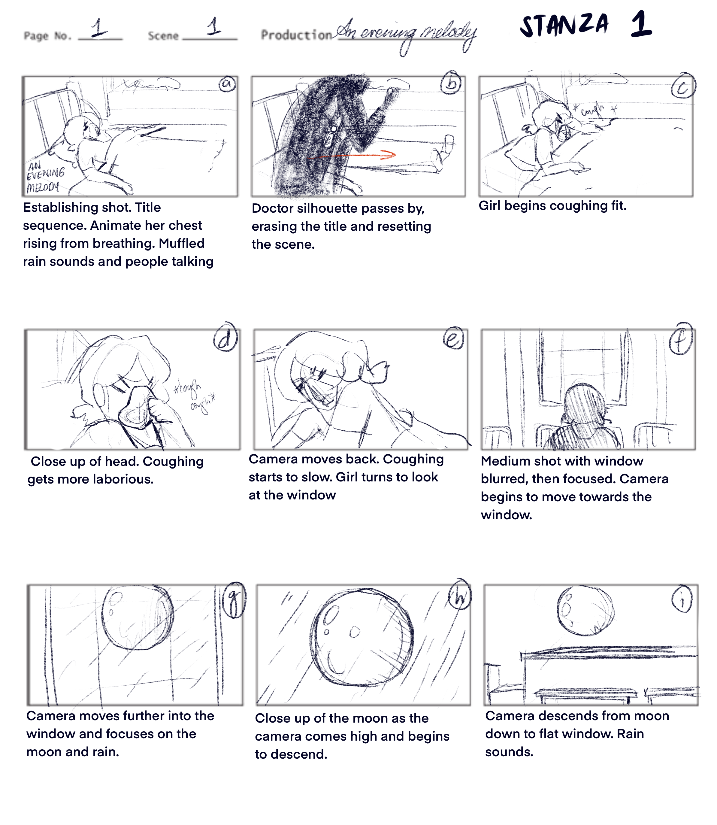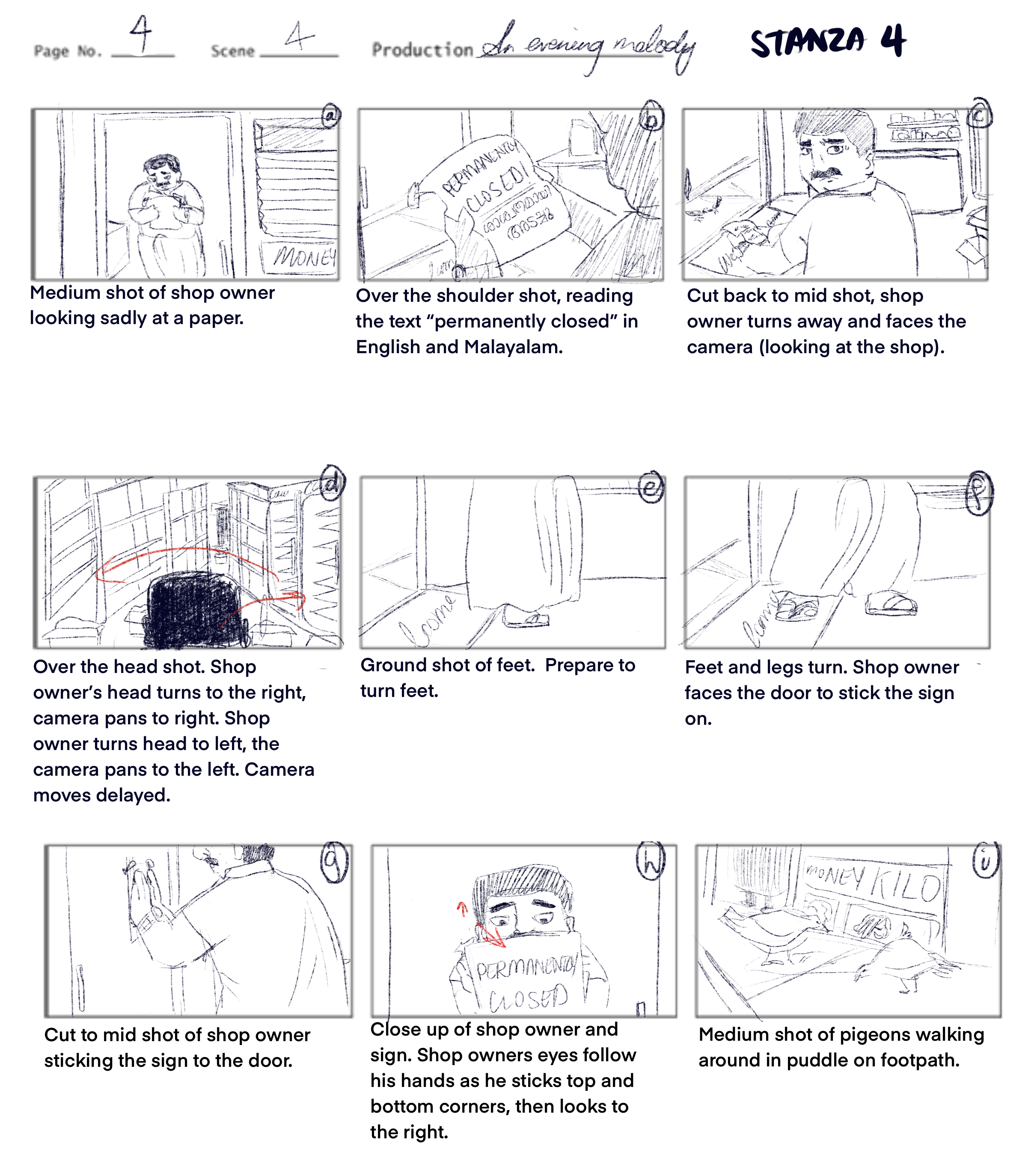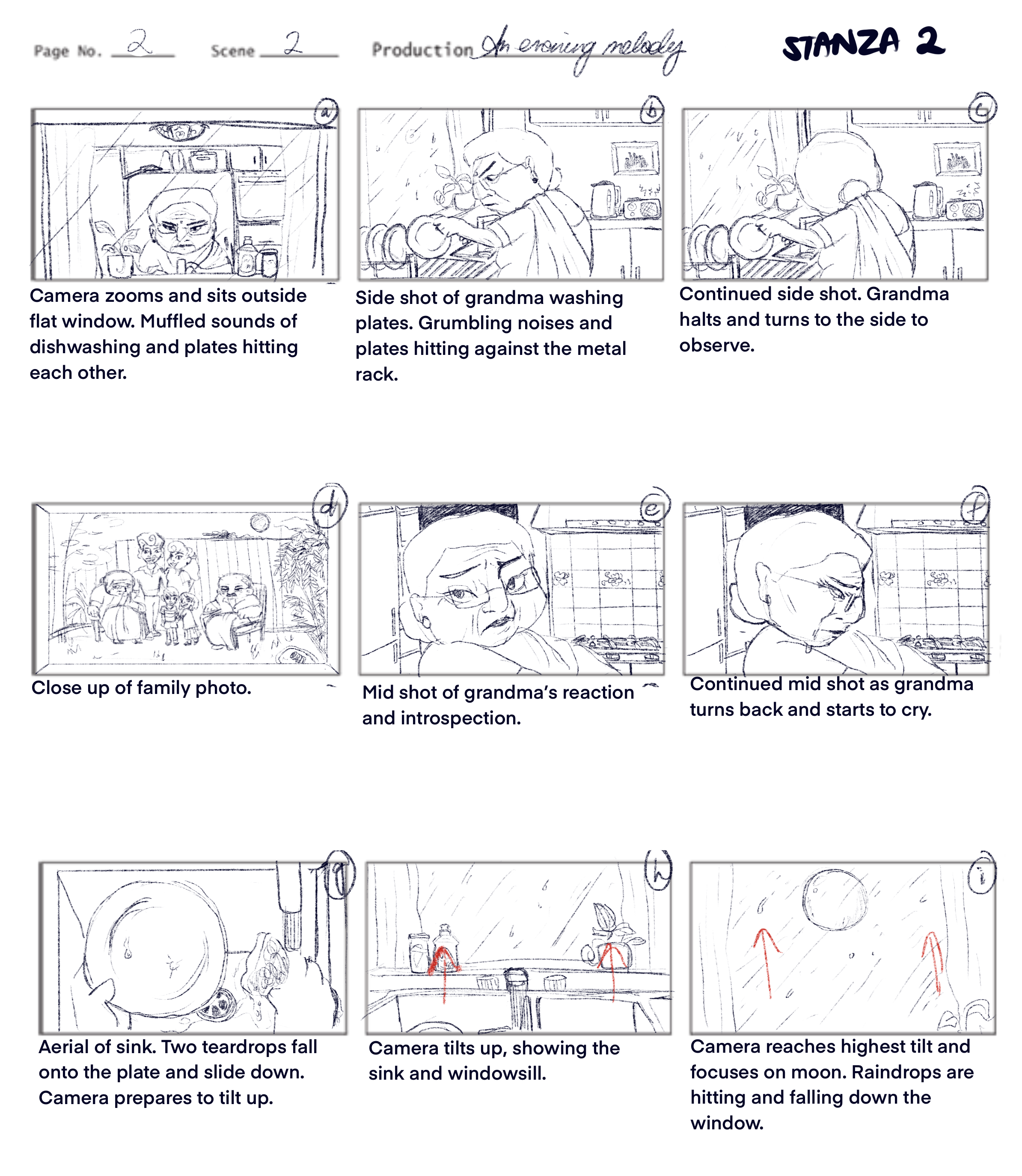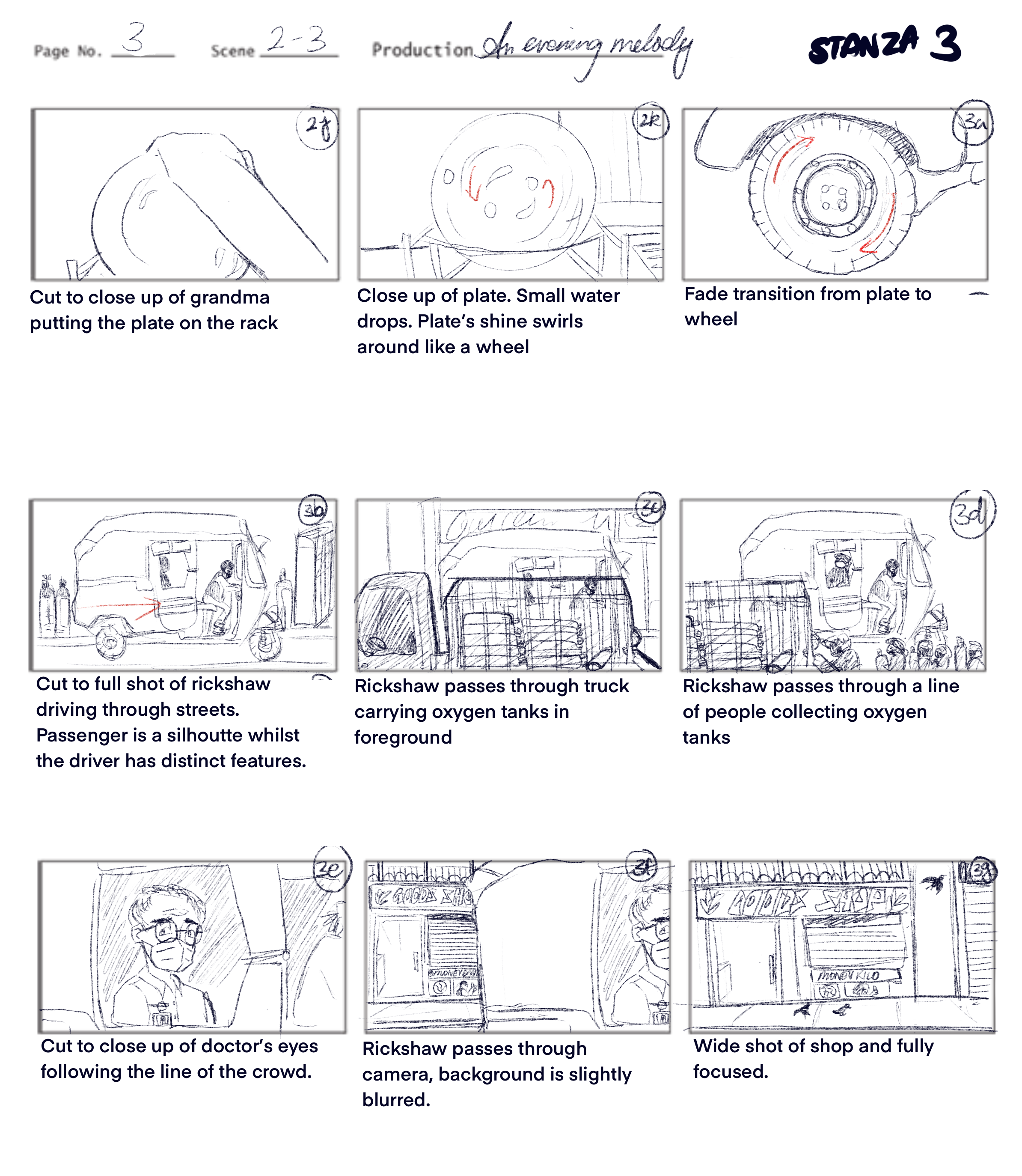 I co-directed and wrote the story. Within pre-production, I drew the storyboards and contributed to character design. During production, I roughed, lined and coloured the kitchen, autorickshaw and store shots. I assisted with comping on After Effects.